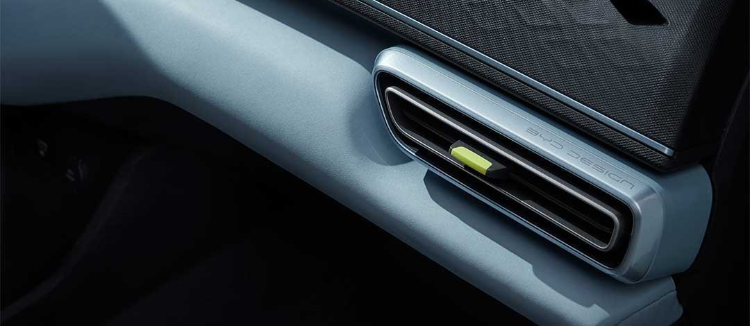 Ventilasi AC BYD Atto 1 dirancang dengan garis tegas dan aksen warna bergaya cyberpunk, menciptakan atmosfer kabin modern yang energik sekaligus penuh nuansa futuristik.